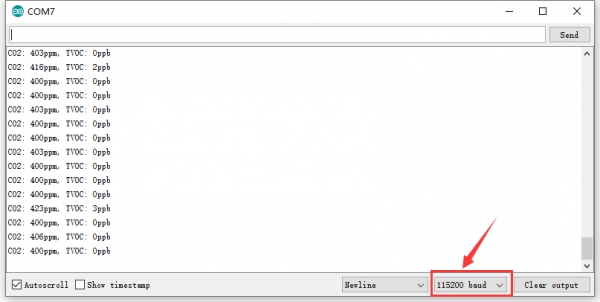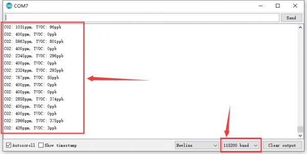 Hook up according to the wiring diagram, upload the code, plug in power, open the serial monitor and set the baud rate to 115200. Then the corresponding data is shown. The data is incorrect at the beginning, wait a few minutes (up to 20 minutes) until it is stable