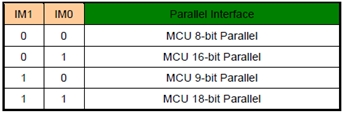 MCU Parallel Interface Bus and Serial Interface select IM2='1', Parallel Interface IM2='0', Serial Interface