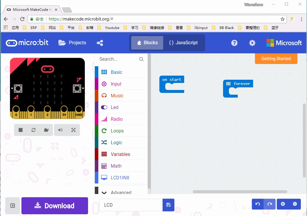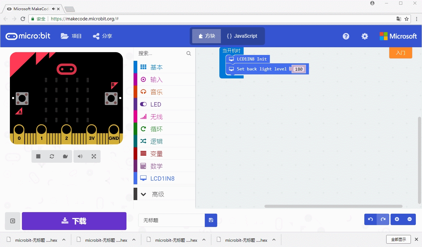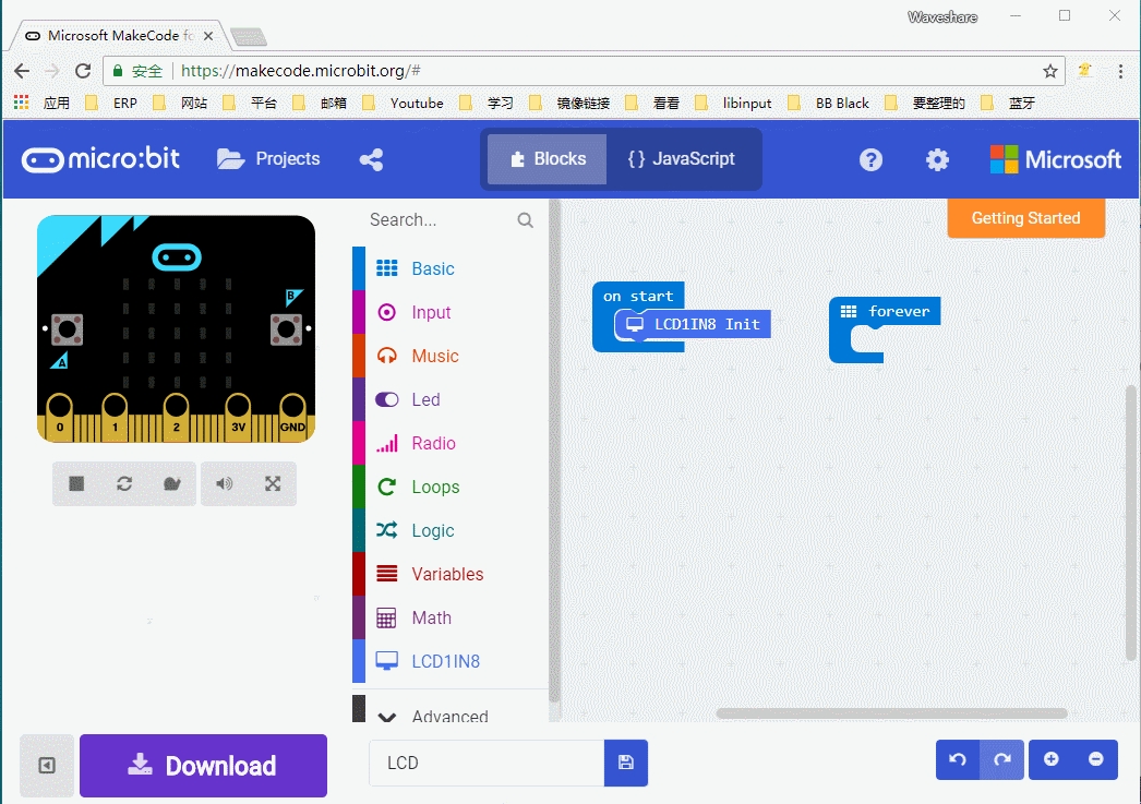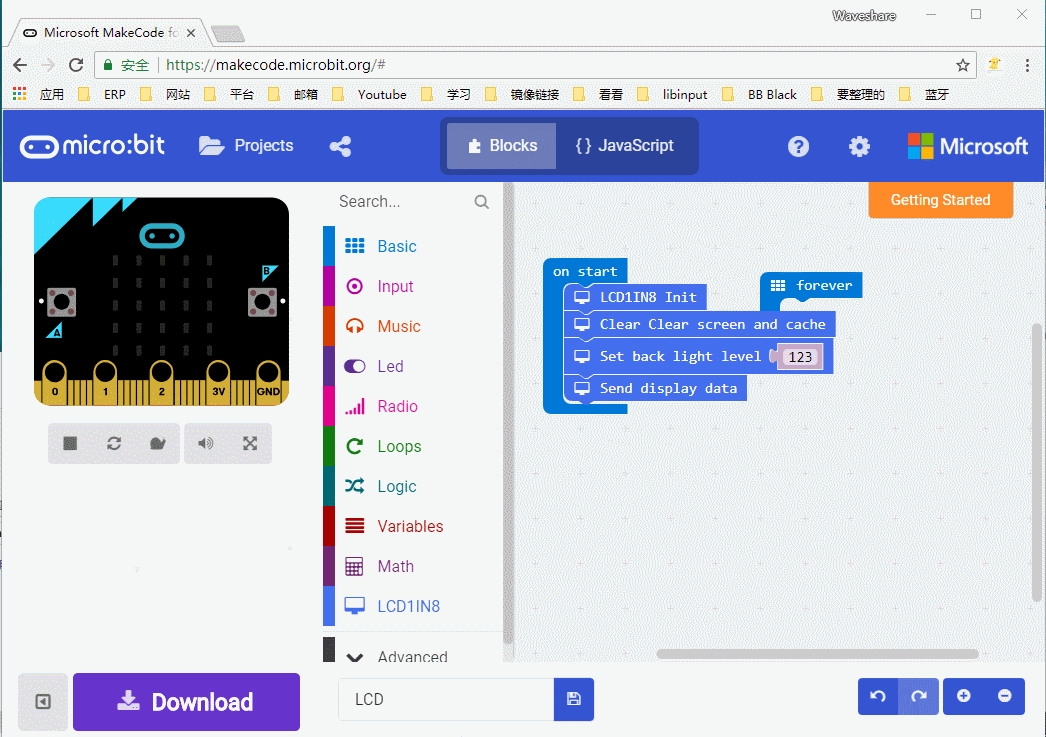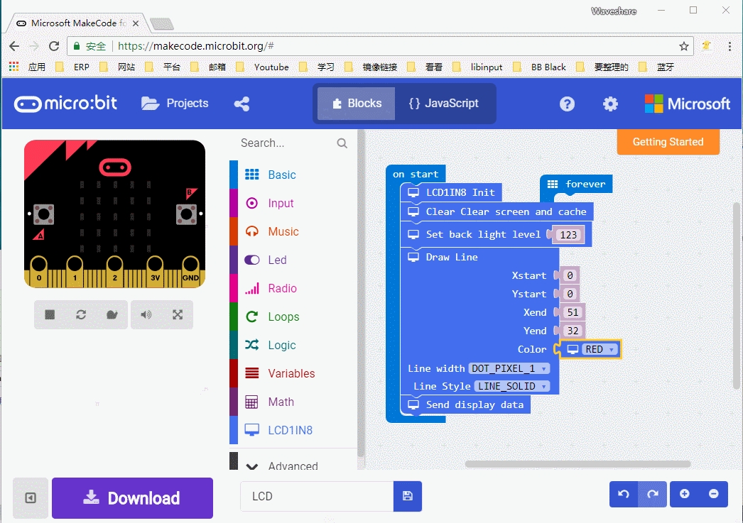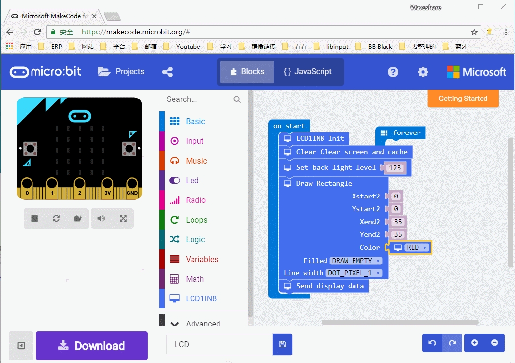 You can get the package of 1.8inch LCD for micro;bit from github. Click More..->Add Package, then copy the URL to the Edittext.