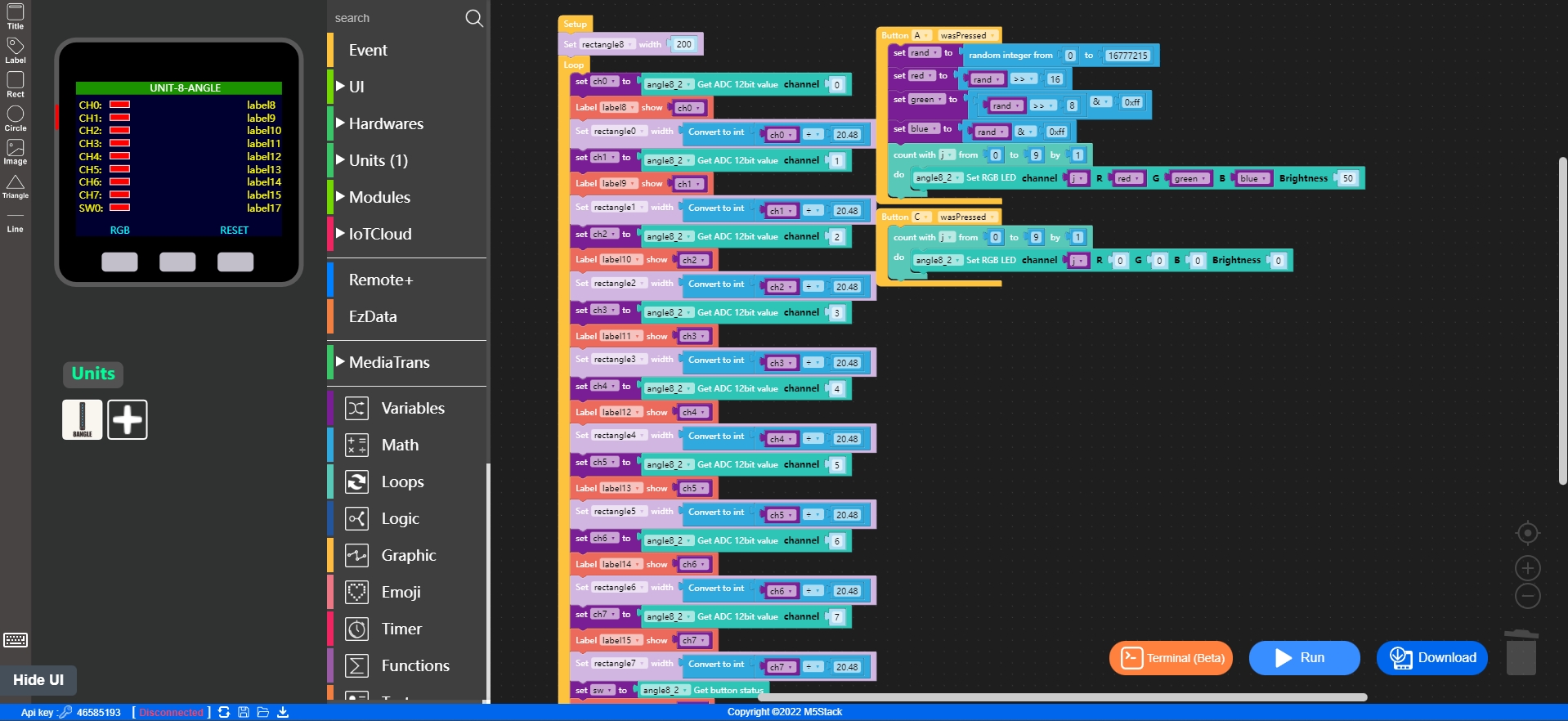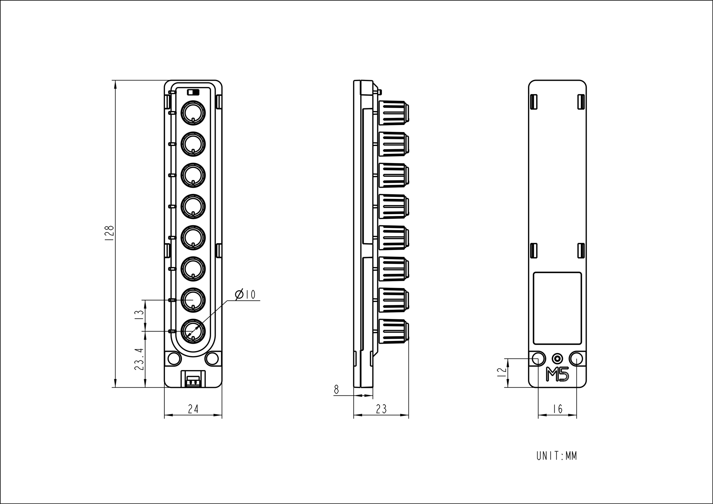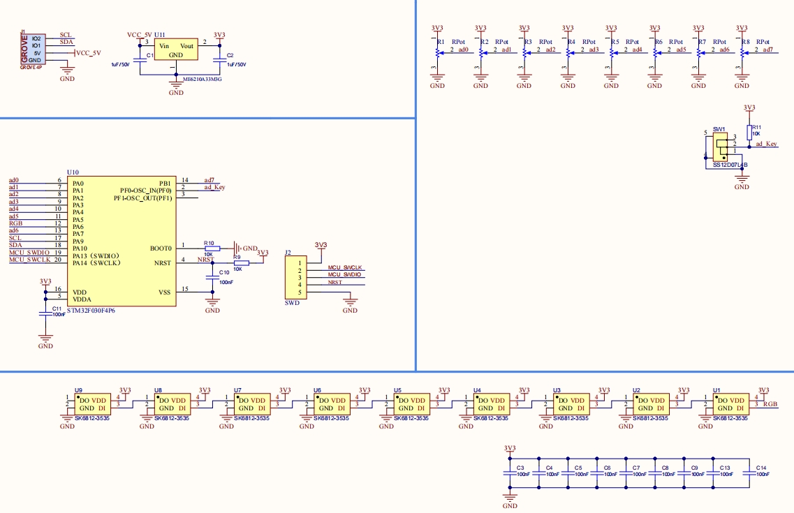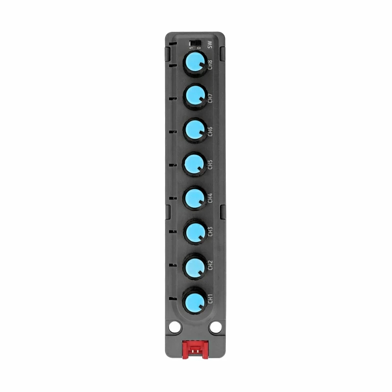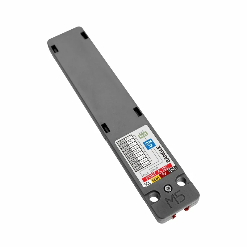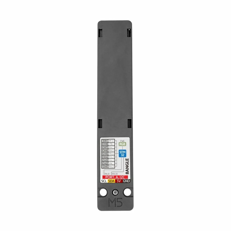 UNIT 8Angle is an input unit integrating 8 adjustable potentiometers, internal STM32F030 microcomputer as acquisition and communication processor, and the host computer adopts I2C communication interface, each adjustable potentiometer corresponds to 1 RGB LED light, and there is also a physical toggle switch and its corresponding RGB LED light, containing 5V->3V3 DCDC circuit. The unit can be used for multi-channel absolute control value input, the corresponding RGB lamp can display different states, and the toggle switch can be used for multi-channel switching input. Can be used as a multi-degree-of-freedom robot or an application in music equalization.