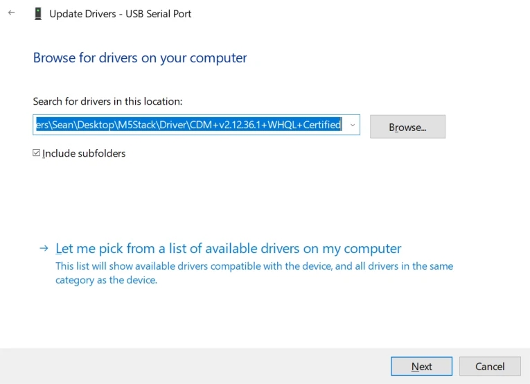 Connect the device to the PC, open the device manager to install FTDI driver for the device. Take the win10 environment as an example, download the driver file that matches the operating system, unzip it, and install it through the device manager. (Note: In some system environments, the driver needs to be installed twice for the driver to take effect. The unrecognized device name is usually M5Stack or USB Serial. Windows recommends using the driver file to install directly in the device manager (custom Update), the executable file installation method may not work properly). Click here to download FTDI driver
