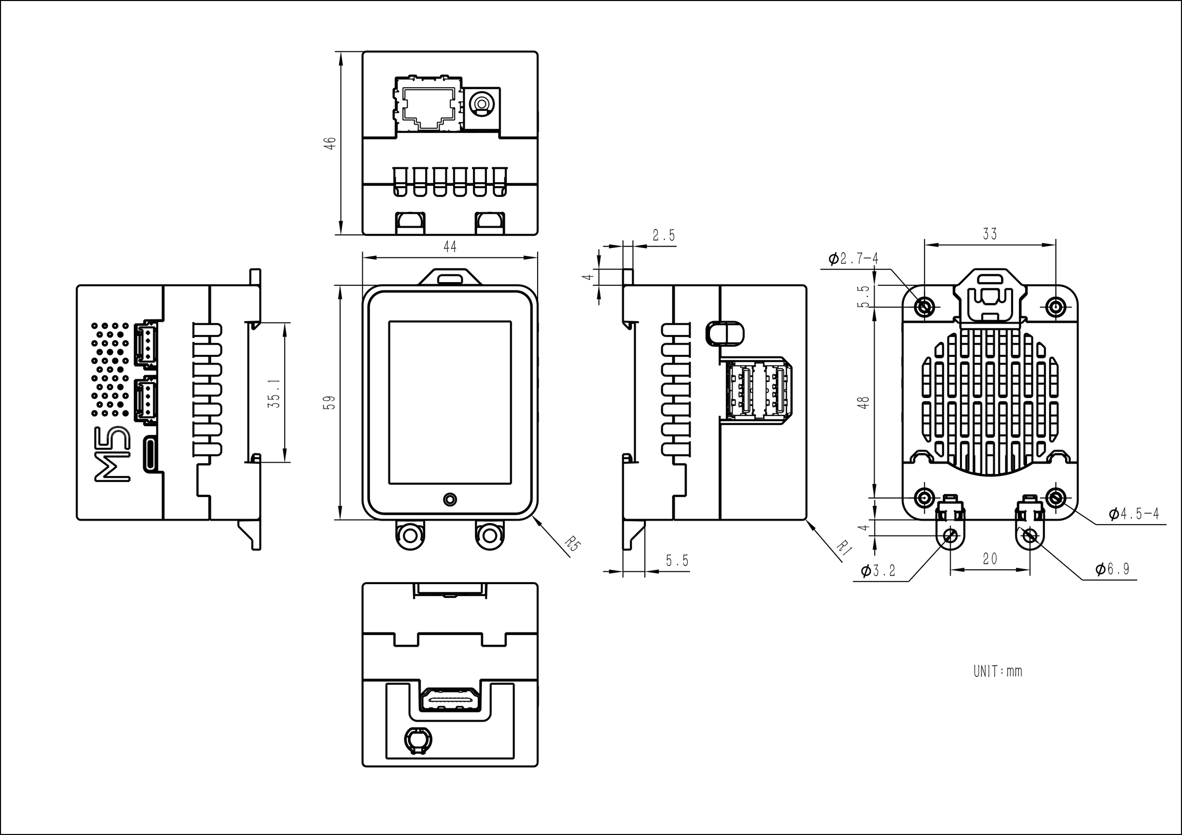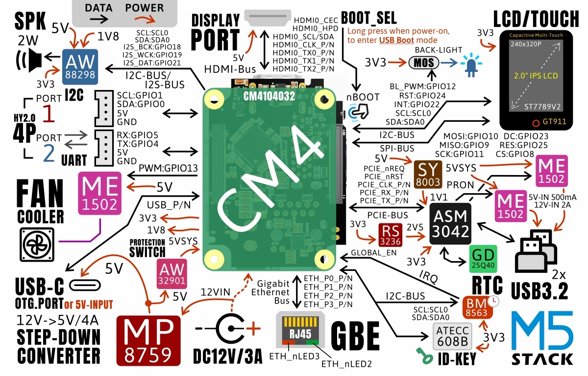CM4STACK is an all-in-one micro host based on the Raspberry Pi CM4 Core Board, featuring the CM4104032 model with built-in Wi-Fi, 4GB of RAM, and 32GB eMMC. This host includes a wealth of peripherals: a 2.0-inch IPS-LCD touchscreen with a resolution of 320x240, 2 USB3.2-A ports (PCIe + ASM3042), a USB-C (2.0) port with OTG and power delivery support, a high-resolution multimedia signal interface, a Gigabit Ethernet RJ45 port, a DC-JACK power input (12V@3A), 2 HY2.0-4P expansion ports for I2C and UART, a 2W speaker powered by an AW88298 16-Bit I2S amplifier, a secure encryption chip (ATECC608B), and an RTC chip (BM8563). The device also includes an active cooling fan and an aluminum heat dissipation frame. It supports DIN rail, wall mounting, and screw fixing, making it suitable for industrial automation, smart home, IoT, and other applications.