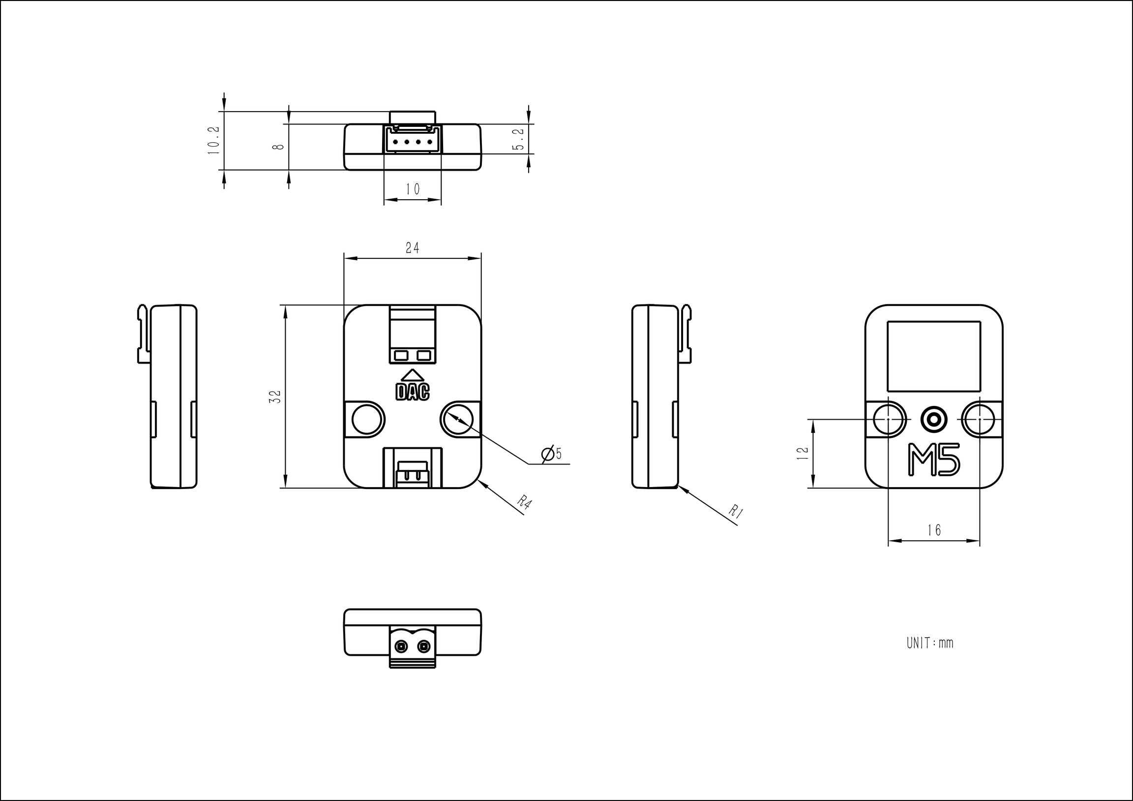 DAC, is a unit with the ability to convert digital signal to analog signal (voltage waveform signal) with support for audio waveform and more. It integrates a 12-bit high resolution DAC chip named MCP4725 which has an on-board non-volatile memory (EEPROM). The unit communicates with the M5Core using the I2C protocol.