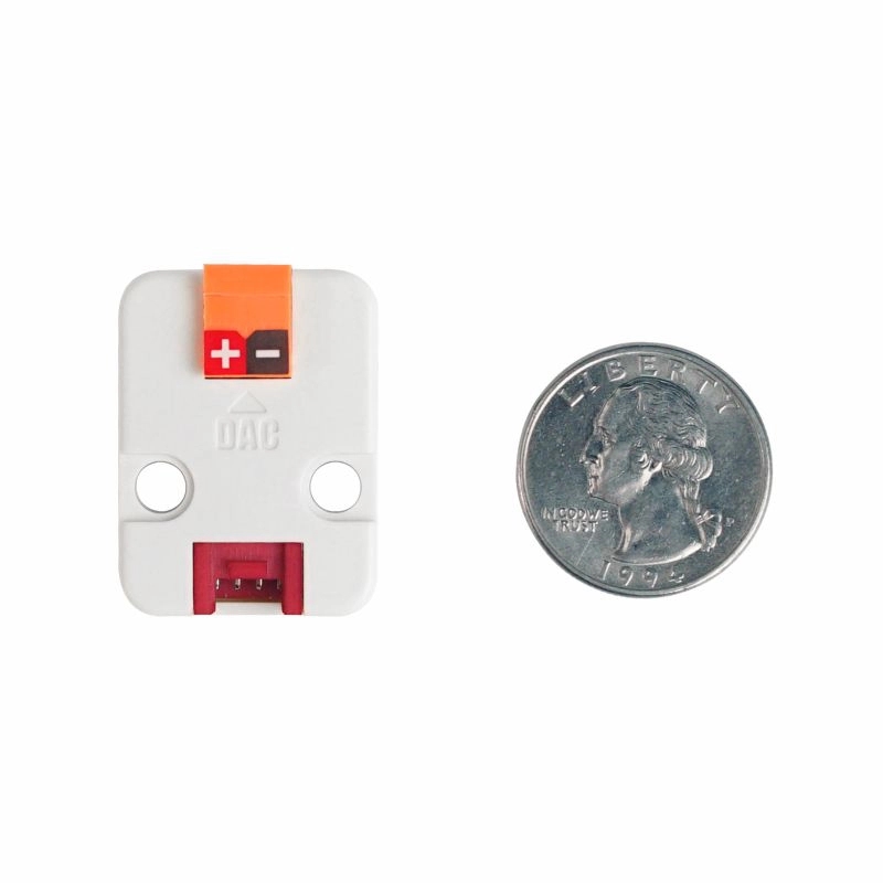 DAC, is a unit with the ability to convert digital signal to analog signal (voltage waveform signal) with support for audio waveform and more. It integrates a 12-bit high resolution DAC chip named MCP4725 which has an on-board non-volatile memory (EEPROM). The unit communicates with the M5Core using the I2C protocol.