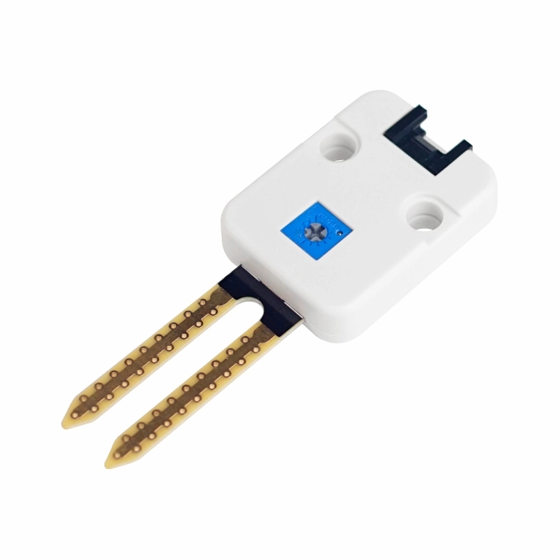 The soil moisture sensor usage is pretty straight forward, the two large exposed pads function as probes for the sensor, together acting as a variable resistor.
