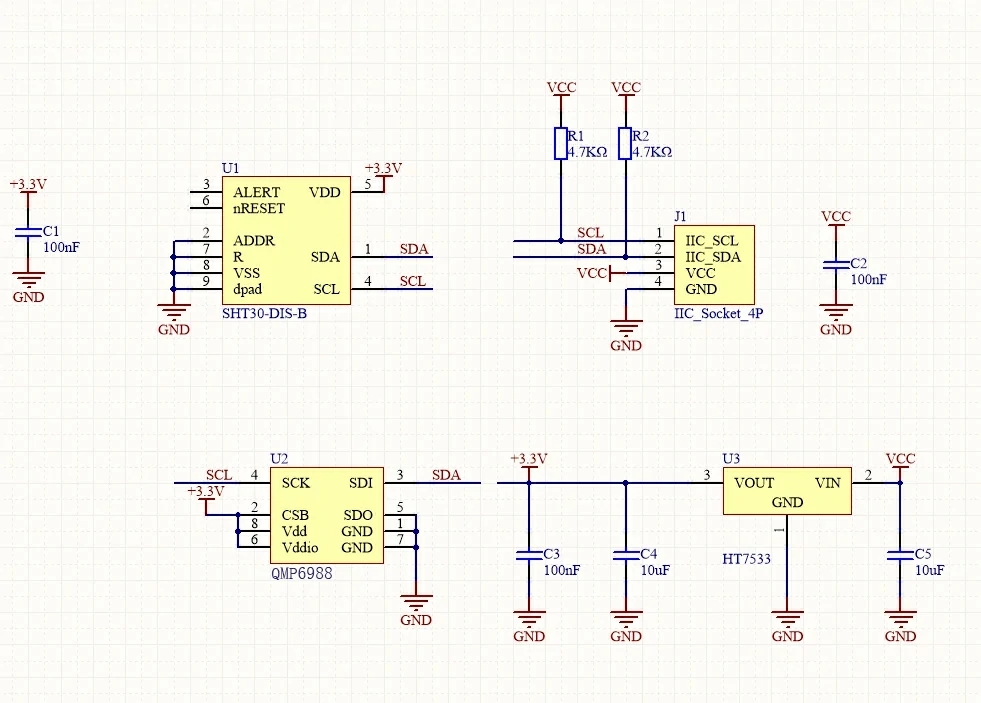 ENV III is an environmental sensor that integrates SHT30 and QMP6988 internally to detect temperature, humidity, and atmospheric pressure data. SHT30 is a high-precision and low-power digital temperature and humidity sensor, and supports I2C interface (SHT30:0x44 , QMP6988:0x70).QMP6988 is an absolute air pressure sensor specially designed for mobile applications, with high accuracy and stability, suitable for environmental data collection and detection types of projects.