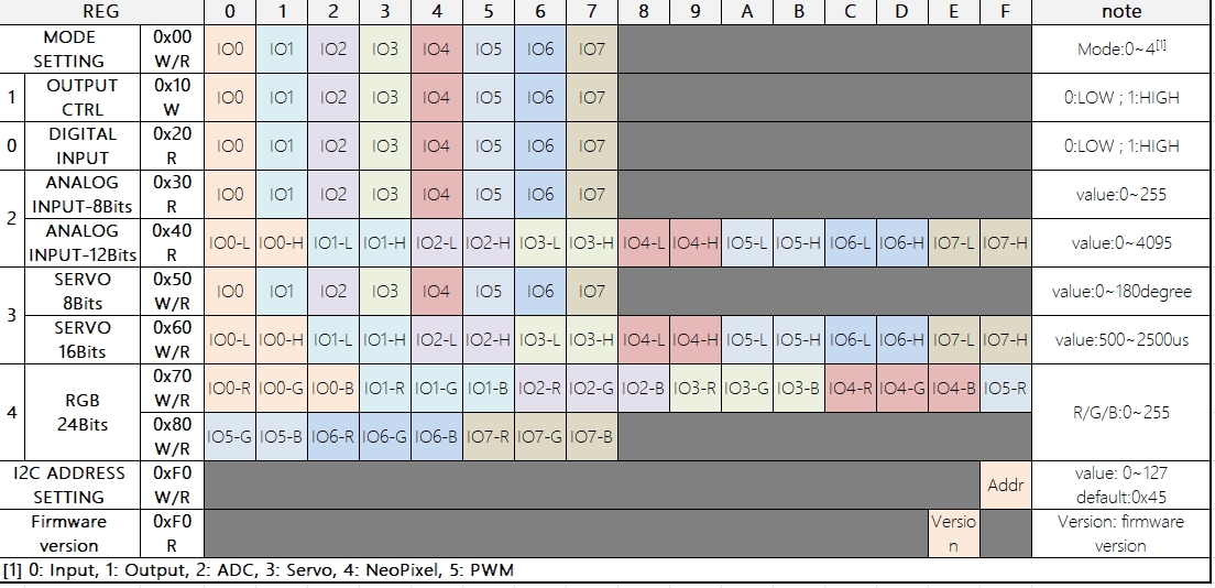 EXT.IO2 is an IO extended unit, based on STM32F030 main controller, using I2C communication interface and providing 8 IO expansion. Each IO supports independent configuration of digital I/O, ADC, SERVO control, RGB LED control modes. Supports configuration of device I2C address, which means that users can mount multiple EXT.IO2 UNITs on the same I2C BUS to extend more IO resources. Suitable for multiple digital/analog signal acquisition, with lighting/servo control applications.