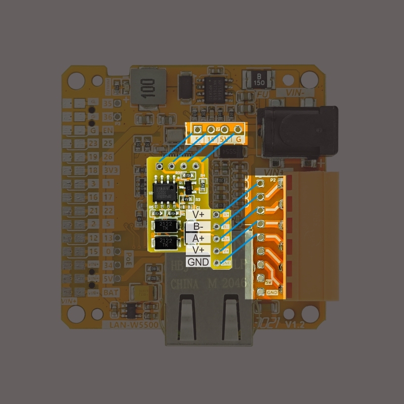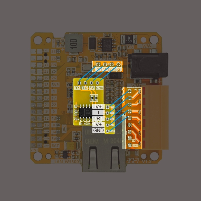 LAN BASE V12 comes standard with two adapter boards, TTL-RS485 + TTL-RS232, which are used to adapt to different communication interfaces. The welding positions are as follows. Please refer to the pin mapping table for the actual connection to GPIO.