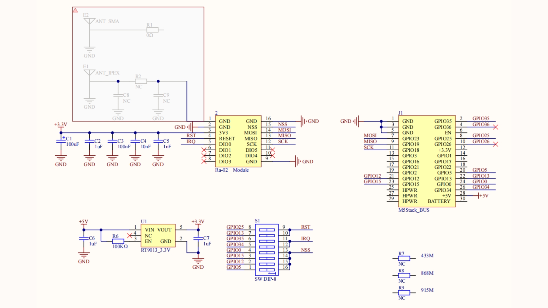The LoRa433_V1.1 Module is a part of the M5Stack stackable module series and is a LoRa communication module operating at a frequency of 433MHz, utilizing the Ra-02 module (SX1278 chip) solution. This module comes with a default external SMA antenna and also features two additional patch MCX pad interfaces, allowing users to switch between different types of antennas based on their needs. Additionally, the module is equipped with a dip switch, enabling users to easily switch between different communication pins. It supports multiple stackable uses simultaneously, offering more customization and flexibility. It is suitable for remote monitoring, smart cities, home and industrial automation, IoT devices, and more.