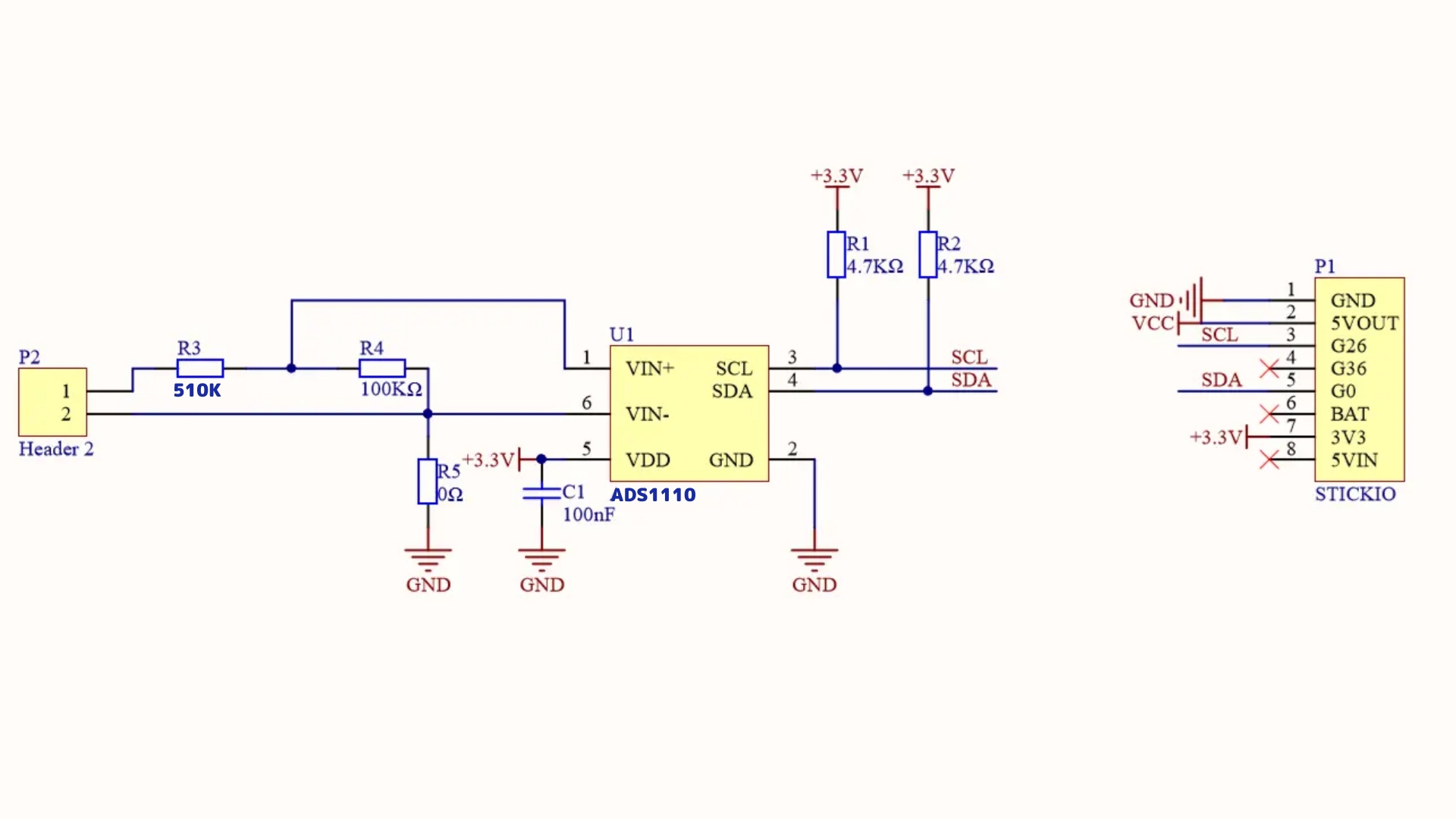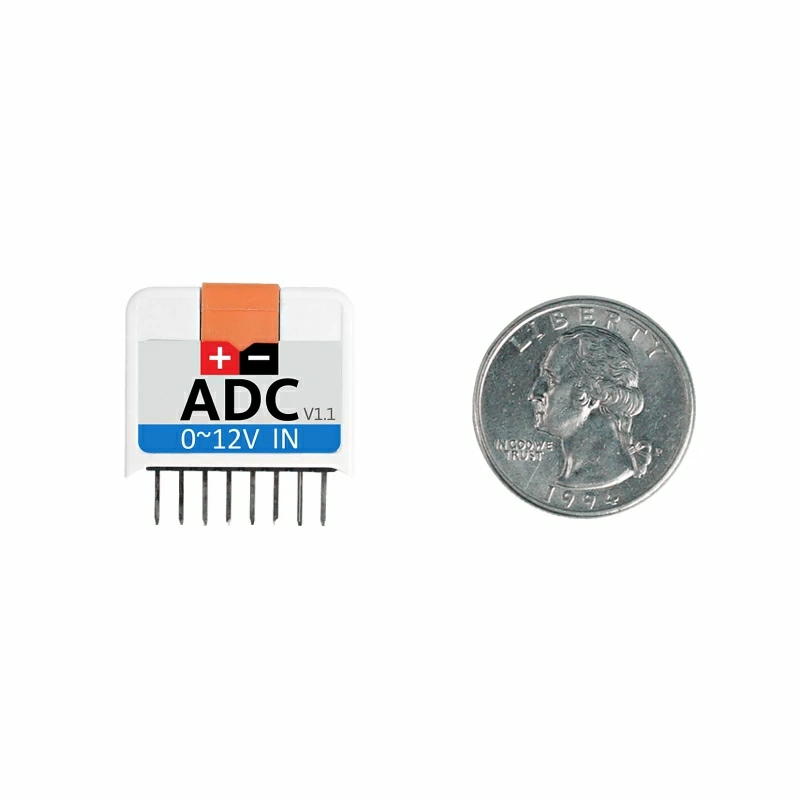 ADC HAT V1.1 is another type of C-HAT specifically design for M5StickC controller. Same as ADC unit, this is an ADC converter component for stickc. Packed with an ADC converter chip ADS1110, which is a fully differential, 16-bit, self-calibrating, delta-sigma A/D converter. Extremely easy to design with and configure, the ADS1110 allows you to obtain precise measurements with a minimum of effort. The ADS1100 consists of a delta-sigma A/D converter core with adjustable gain, a clock generator, and an I2C interface. ADS1110 itself is able to accept a differential input from -5 ~ +5 V, but we have limited the input to 0~12V by adding on the peripheral circuit design of this IC.