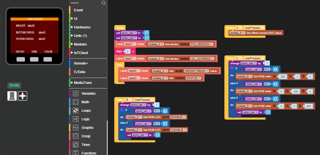UNIT Scales is a high precision low-cost I2C port weighing sensor, with a total weighing range of 20kgs. Adopt STM32F030 as the controller, HX711 as sampling chip and 20 kgs weighing sensor. With tare button and programable RGB LED. This Unit offers the customer with a highly integrated weighing solution, suitable for the applications of weighing, item counting, item movement Checking and so on.