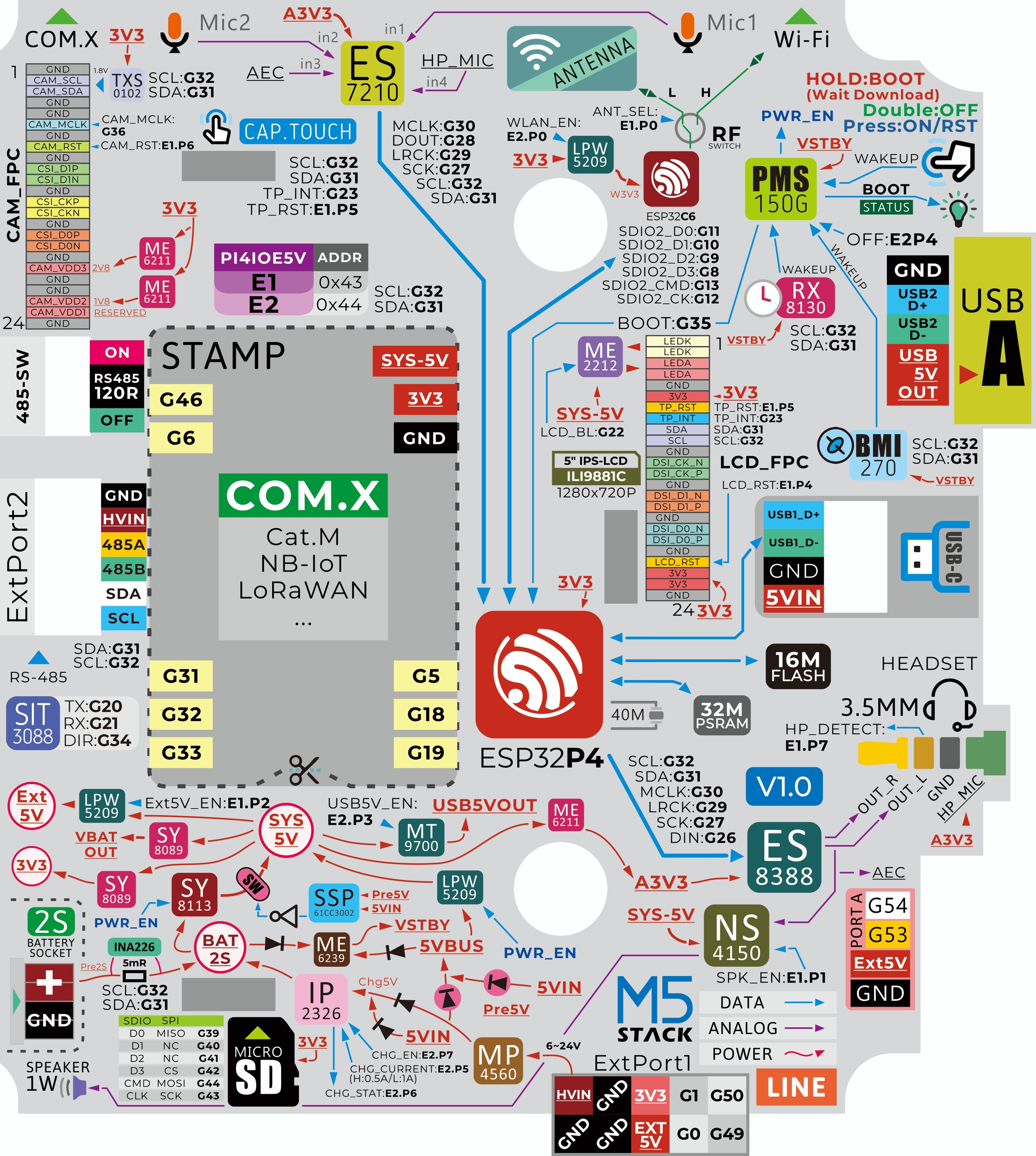 For peripheral interfaces, Tab5 offers USB‑A (Host) and USB‑C (USB 2.0 OTG) ports for connecting traditional peripherals like a mouse or keyboard; industrial scenarios can use RS‑485 (SIT3088 + DIP switch–selectable 120 Ω termination) bus communication. Grove, M5BUS, GPIO_EXT header, and Micro SD card slot, as well as reserved STAMP pads (supporting Cat.M, NB‑IoT, LoRaWAN, etc.), allow flexible expansion with various sensors and communication modules. It also includes Reset/Boot buttons for quick reset and entering firmware download mode.