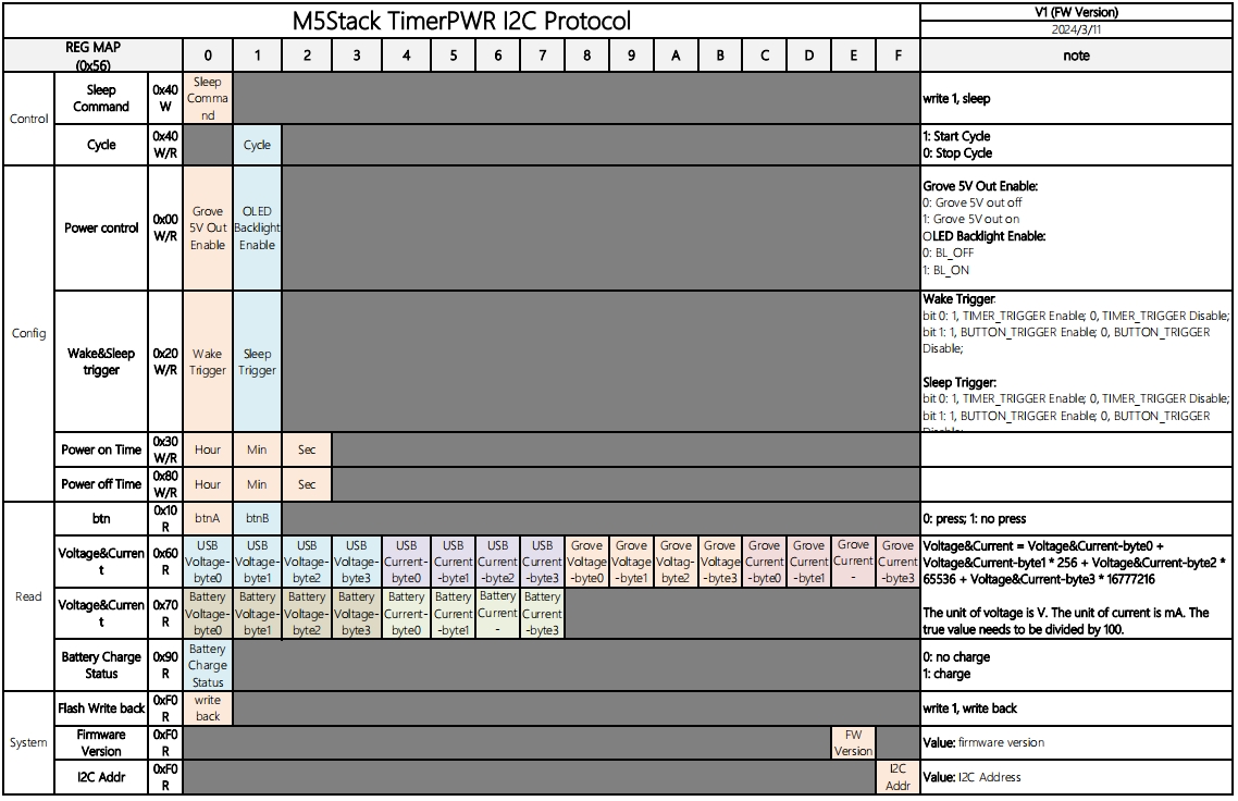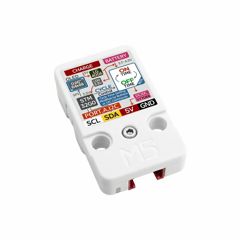 The TimerPWR Unit is a timed power supply unit whose main functions are "charging & discharging + timed switching + screen display + boost output." It features an internal STM32 microcontroller that implements RTC and overall control, allowing users to set automatic power on/off times as needed. It is powered via the Type-C interface and can be connected to an external rechargeable battery via a 1.25-2P interface. The unit includes a built-in battery charging circuit supporting a charging current of 330mA. It also features an integrated DCDC boost circuit that provides a 5V/800mA (1400mA @ 1C battery power) power output to external devices via the Grove port. Additionally, the INA3221 sensor is built-in, allowing real-time monitoring of power input and output current and voltage. The unit is equipped with a 0.66-inch OLED display and two side buttons for user interaction, making it easy to view real-time system status and modify settings. Users can set parameters such as power on/off using the side buttons or via the I2C bus through the Grove interface with I2C commands. This product is suitable for smart homes, industrial automation, and timed control devices.