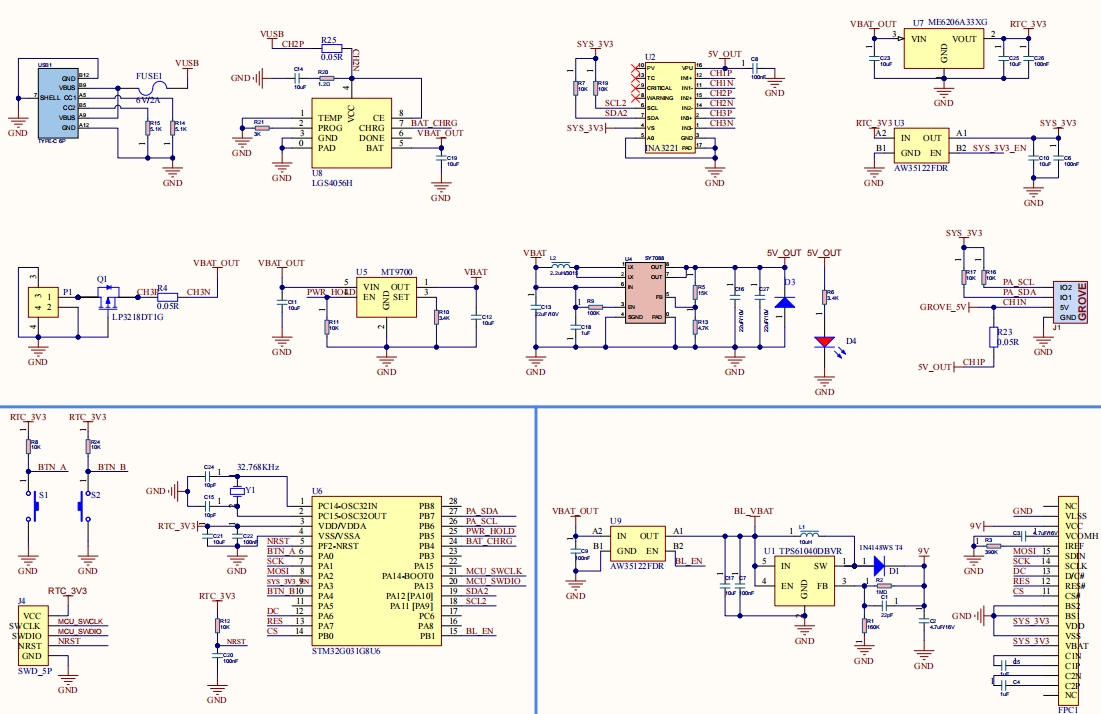 Type-C interface: for battery charging (cannot power Grove port directly) Grove interface: for external sensors and modules, supports communication and power output Battery interface: 1.25mm@2P