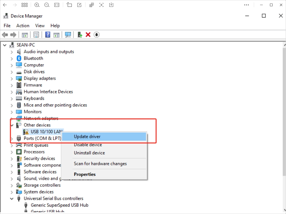 Extract the driver compressed package to the desktop path -> Enter the device manager and select the currently unrecognized device (named with SR9900) -> Right-click and select Custom Update -> Select the path where the compressed package is decompressed -> Click OK and wait for the update carry out.