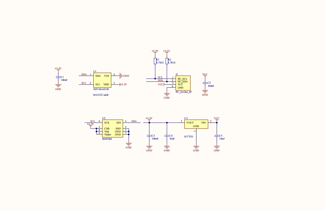 I2C communication interface (SHT40 I2C address: 0x44, BMP280 I2C address: 0x76)