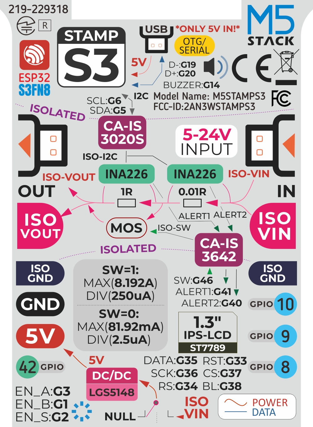 VA Meter is a professional programmable high-precision power meter designed for accurate voltage and current measurement. This product is based on the M5StampS3 main control module, supporting WiFi functionality. It features two serially connected INA226 current and voltage measurement circuits, providing current detection resolutions of 2.5uA and 250uA, and supports a measurement range of 0-5A and 5-24V (1-24V in isolation mode). The product can be powered through a USB-C interface or Base terminal input and includes built-in power and signal isolation. Users can select between isolated measurement via USB power or non-isolated measurement using direct power through a toggle switch, catering to different application needs. The accompanying expansion BASE includes relay on/off control and a Grove port for secondary development.
