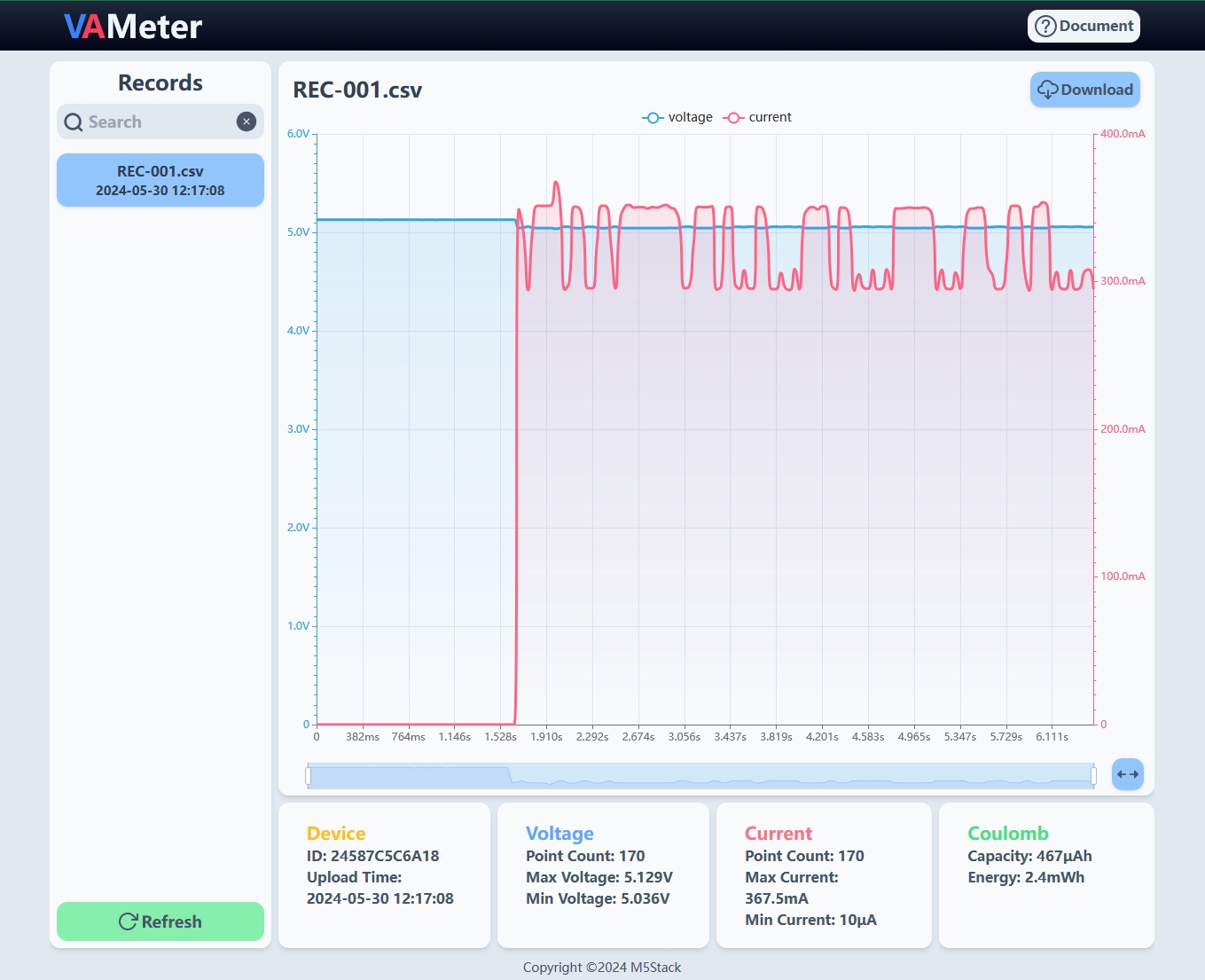 Additionally, the instrument supports OTA firmware upgrades and USB MSC/OTG functionality, allowing users to edit and view data and configuration files stored in the main control file system on a PC. M5 also provides a free online data API interface, enabling users to upload test data to the EZData platform for remote access and browsing, significantly simplifying IoT application development. The VA Meter is a versatile and developer-friendly instrument, ideal for engineering projects requiring precise current and voltage measurements, as well as fields such as industrial automation, equipment monitoring, and smart grids.