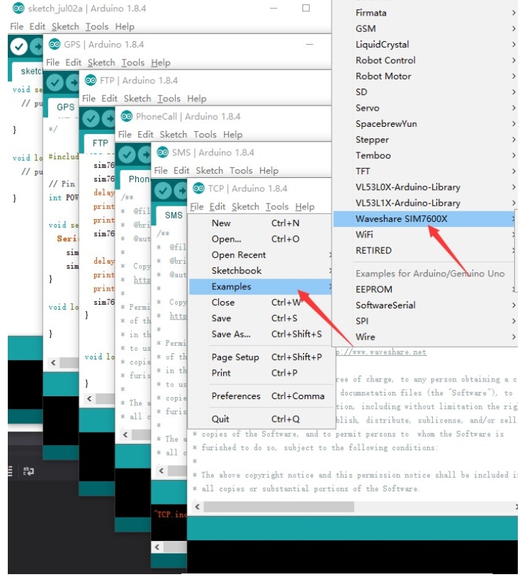 Download the decompression sample demo. Copy the Waveshare_SIM7600X_Arduino_Library folder to the Library directory under the Arduino IDE installation path. Open Arduino IDE --> File --> Examples --> Waveshare SIM7600X, and then choose to run the corresponding example demo: